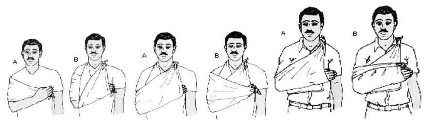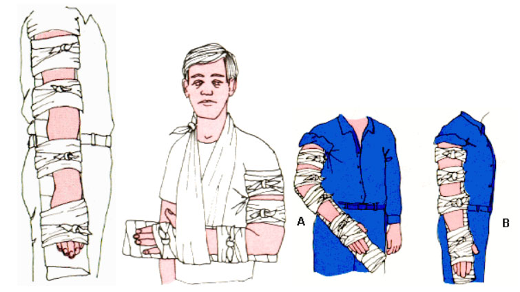 Ejemplo: Cuando sospeche fractura de codo, inmovilice hombro y muñeca. Ate las vendas firmemente. no amarre sobre el sitio de la fractura, los nudos deben quedar hacia un mismo lado.