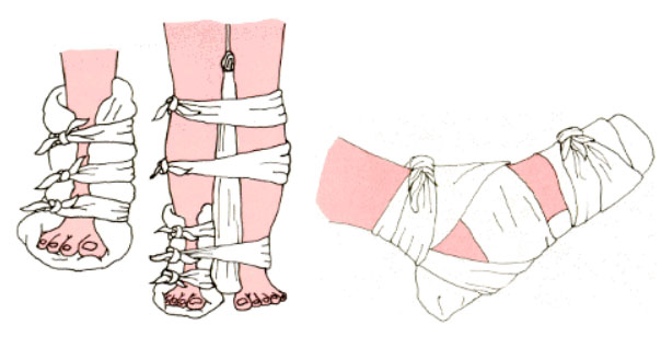 Coloque varias vendas triangulares dobladas en forma de corbata. Desplácelas utilizando los arcos naturales debajo del tobillo, rodilla, cintura, cuello.