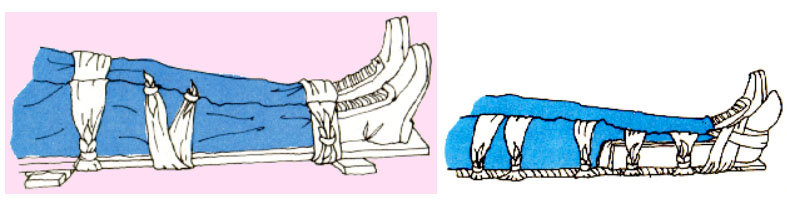 Coloque dos férulas, una en la parte interna y otra en la parte externa, desde la parte superior del muslo hasta el tobillo, protegiendo las prominencias óseas (rodilla, tobillo) y amárrela.