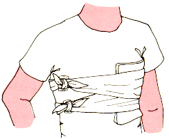 Doble el extremo inferior de la chaqueta o camisa del accidentado y sujételo a la tela con un gancho.Sujete la manga de la extremidad lesionada a la camisa. Utilice una bufanda, correa o corbata para sostener la extremidad.