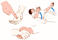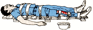 Uno de los auxiliadores realiza tracción manual (hacia arriba y sostenida) de las vértebras del cuello, colocando las manos alrededor de la mandíbula, de manera que los dedos meñiques queden justo por debajo de la mandíbula. Otro auxiliador coloca una tabla corta por detrás de la víctima, desde la cadera hasta la cabeza.