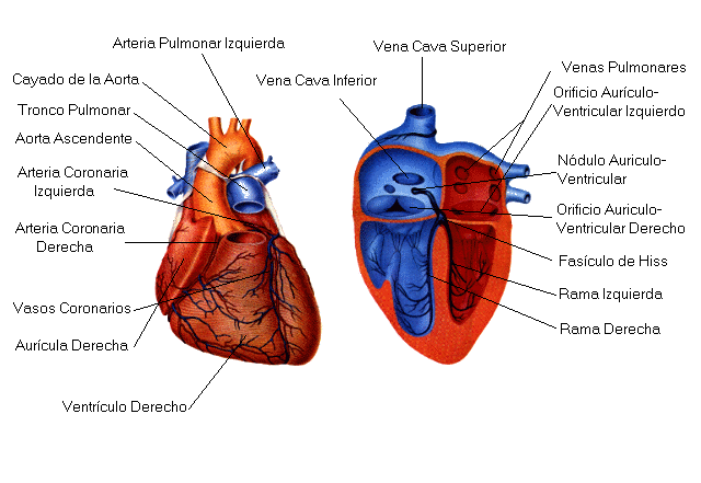 El Corazón es un musculo hueco, del tamaño del puño (relativamente), encerrado en el centro del pecho. Como una bomba, impulsa la sangre por todo el organismo. realiza su trabajo en fases sucesivas. Primero se llenan las cámaras superiores o aurículas, luego se contraen, se abren las válvulas y la sangre entra en las cavidades inferiores o ventrículos. Cuando están llenos, los ventrículos se contraen e impulsan la sangre hacia las arterias.