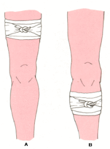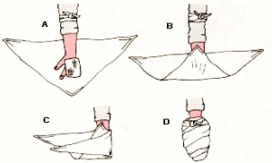 - Doblando la venda hacia atrás en dirección opuesta a la que se llevaba. Cuando se llega al punto en el que se ha realizado el doblaje, se hace un nudo con el cabo suelto de la venda.