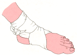 Luego se procede a efectuar varias vueltas en 8 que abarquen alternativamente pie y tobillo, remontando de la parte distal hacia la proximal, para terminar con dos vueltas circulares a la altura del tobillo y la fijación de la venda.